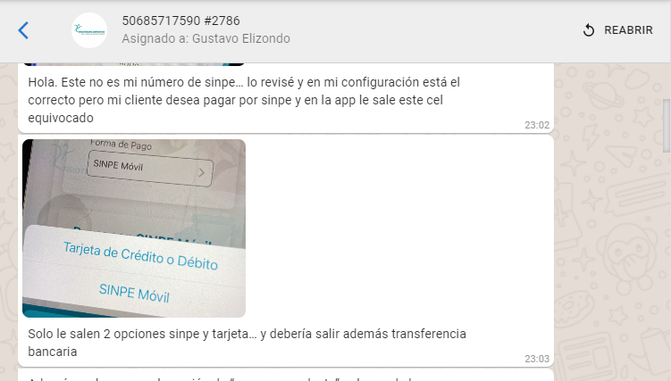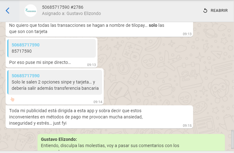 La cliente desea que solo los pagos con tarjeta se hagan a través de Tilopay. Quiere que se habilite nuevamente el número que ella tiene registrado para Sinpe móvil y la cuenta para las transferencias bancarias. El caso se pasa con los compañeros del departamento de desarrollo, Bryan se comunica con ella y se realizan los ajustes para que aparezca el sinpe de ella al igual que su cuenta bancaria.