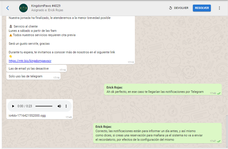 Se verifica la configuración de los recordatorios de whatsapp y todo se ve correcto para notificar a los usuarios 1 día antes de su reserva, se realizan las pruebas en estudio de prueba y funciona correctamente. se le indica al administrador que todo debería funcionar sin problema de manera automática. Además se le indica que si desea verificar las confirmaciones puede ingresar al calendario de reservas, o bien, en su defecto, ver las notificaciones que el sistema le envía a su telegram, medio oficial del administrador para recibir notificaciones.