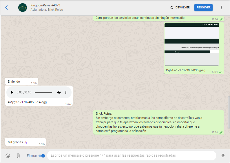 Se le brinda la explicación que para que los servicios aparezcan de manera continua a la hora de elegir varios de estos, se debe tomar en cuenta el tiempo/duración del primer servicio para que cuando este finalice, el segundo servicio comience de inmediato, de lo contrario si no hay un servicio cercano no aparecerán las opciones disponibles.