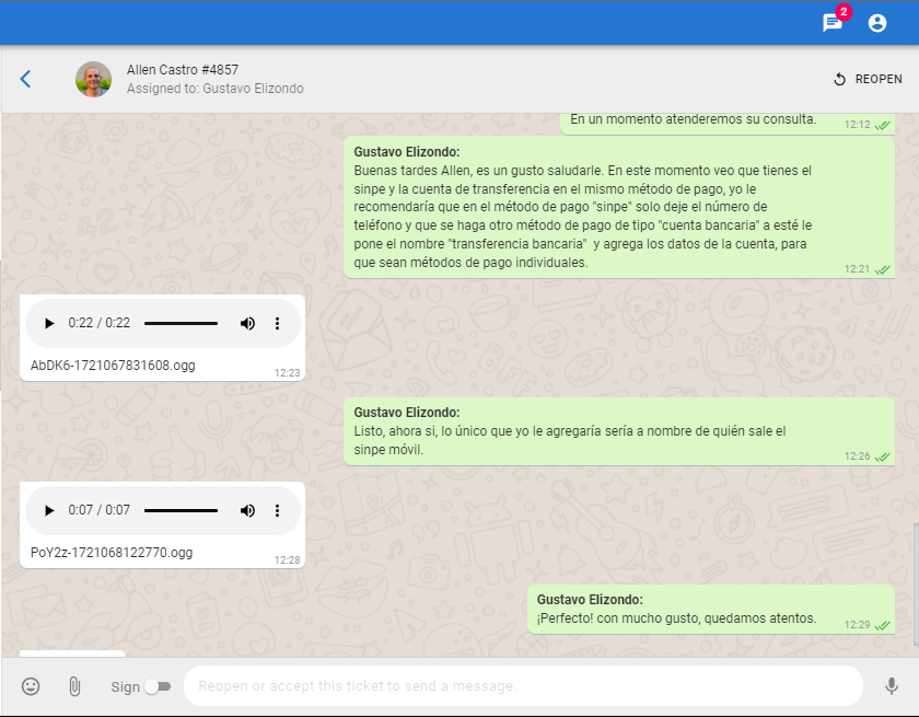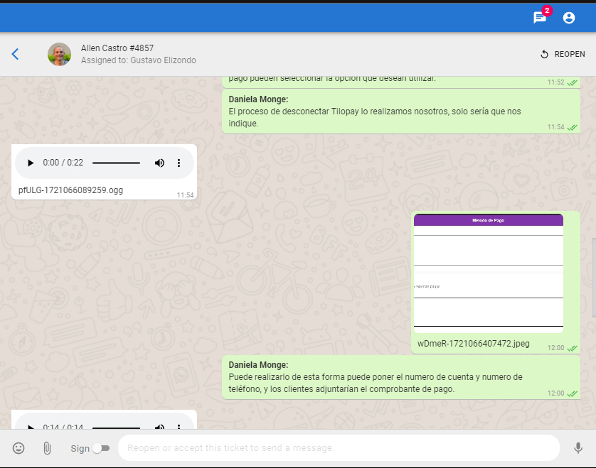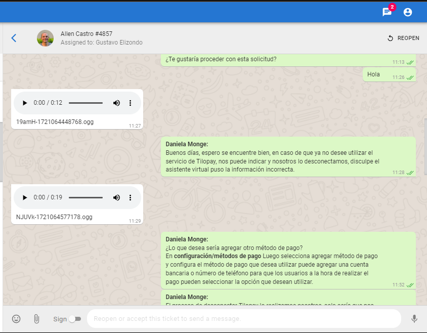 El usuario nos consulta sobre que pasos debe seguir para desconectar Tilopay, se le comenta que nosotros realizamos ese proceso, también consulta sobre como agregar métodos de pago, se le brindan los pasos a seguir.